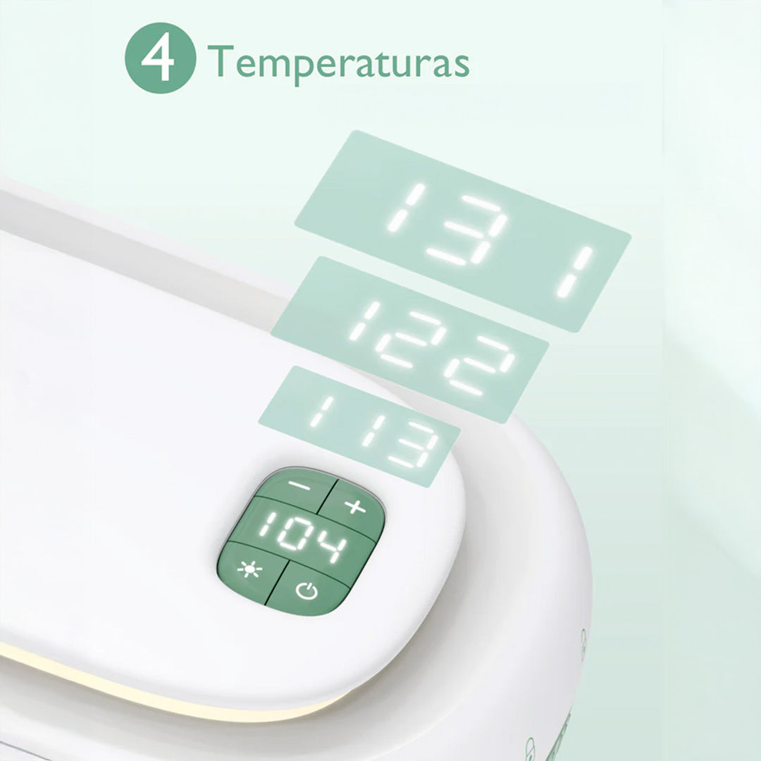 Puedes elegir entre 4 niveles (40 °C, 45 °C, 50 °C y 55 °C), ideal para adaptarse al clima o a la sensibilidad de la piel del bebé.