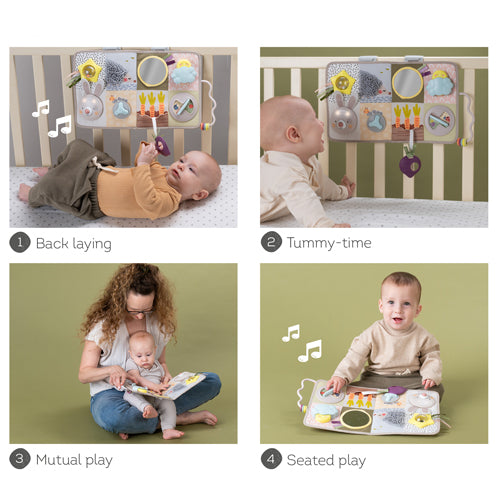 Etapa 2 (3m+): Tiempo boca abajo: muchas funciones para jugar y explorar para un juego duradero mientras el bebé está boca abajo. El libro también puede sostenerse solo para ayudar a fomentar el juego boca abajo.