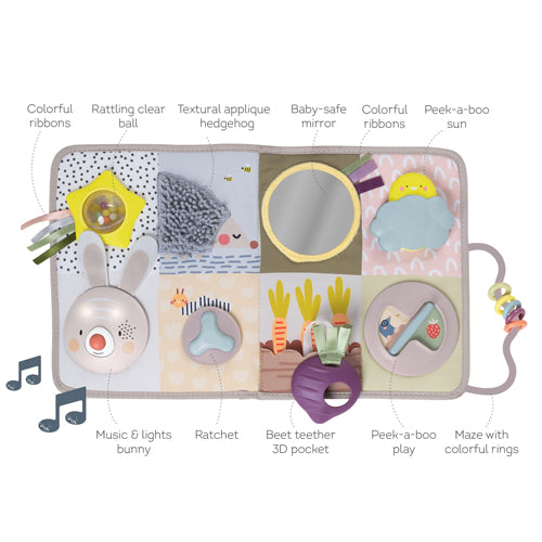 Incluye 13 actividades de desarrollo para el juego y la exploración mutuos: conejito con música y luces, actividades de pick-a-boo, pelota transparente con cascabel, trinquete, cintas de colores, espejo seguro para bebés, laberinto con anillos de colores y más.