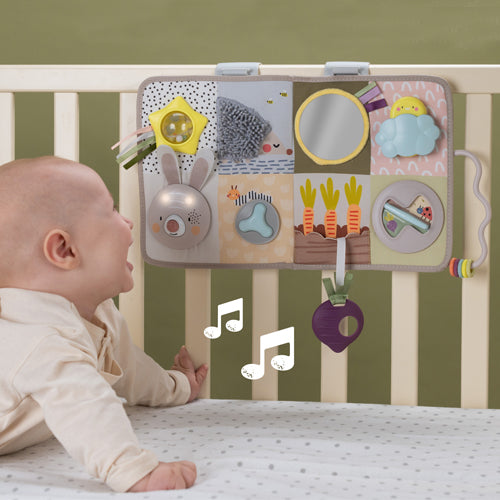 Etapa 1 (0 m+): Acostado boca arriba: colgado en el costado de la cuna, el bebé puede explorar y experimentar varias características y opciones de juego mientras está acostado boca arriba o boca abajo.