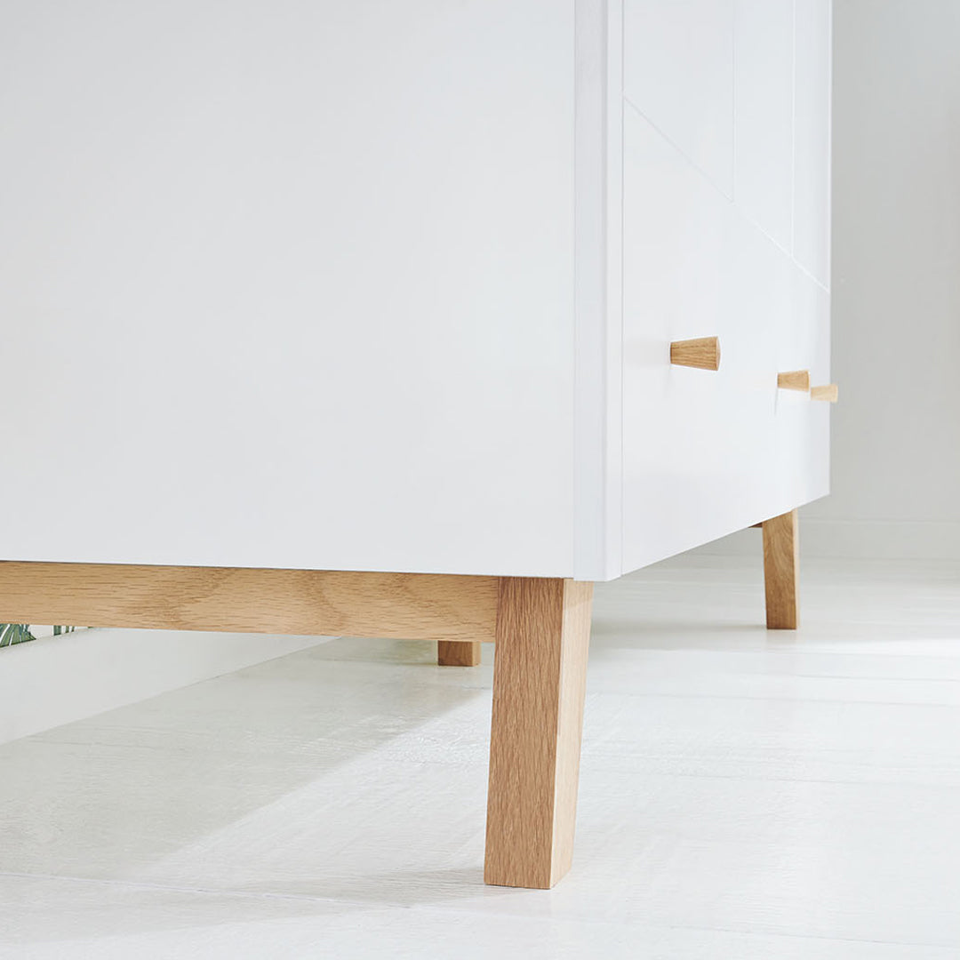Cambiador moderno y amplio con 3 cajones y cambiador extraíble, fabricado en MDF lacado mate, blanco y roble macizo lacado transparente