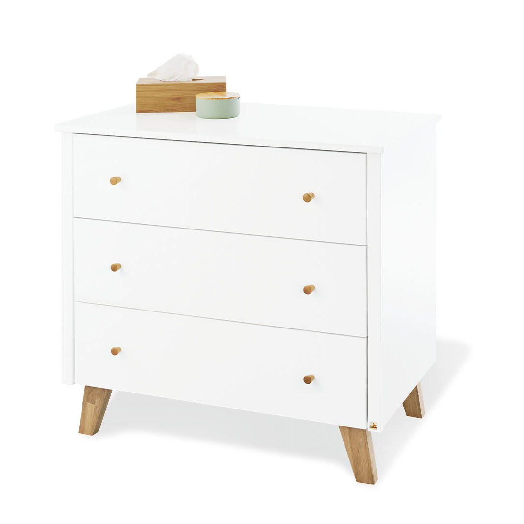 El cambiador 'Pan' es el cambiador ideal para la habitación moderna del bebé y revive los viejos tiempos con su moderno aspecto retro; gracias a la función de cierre suave automático, los 3 cajones espaciosos se cierran suave y silenciosamente en todo momento