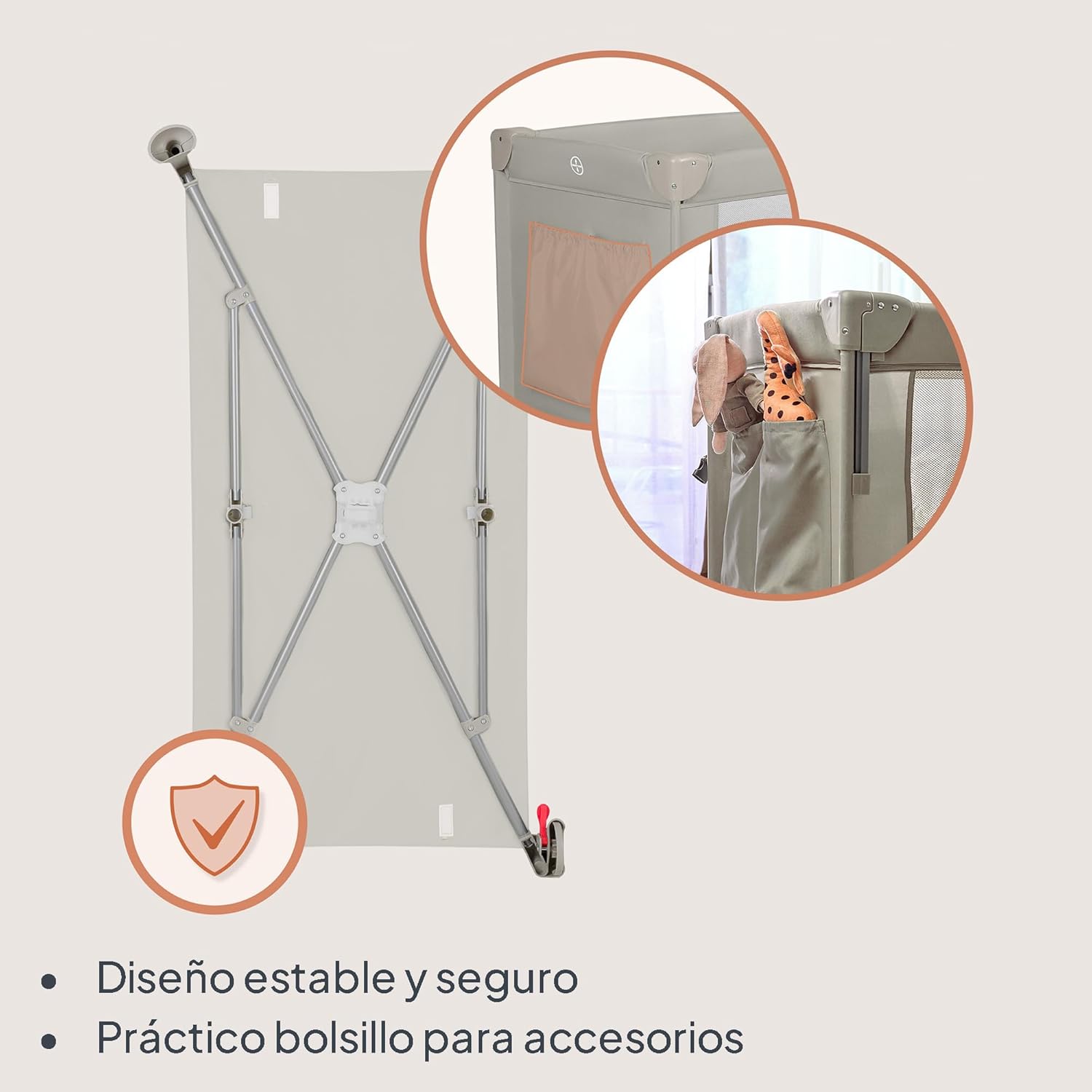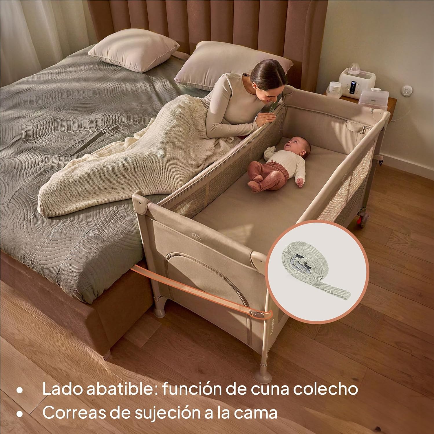 - CUNA COLECHO: el lateral abatible y las correas de sujeción permiten fijar la cuna de forma segura a la cama de los padres. Esto permite que el niño duerma cerca de mamá y papá, lo que facilita las tomas nocturnas, aumenta la sensación de seguridad y favorece el vínculo afectivo desde los primeros días.