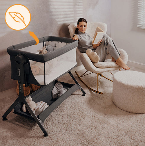 Una cuna ligera que se puede desplazar fácilmente por toda la casa. Proporciona acceso cómodo al niño pequeño, sueño confortable, ventilación adecuada y seguridad en caso de regurgitación.