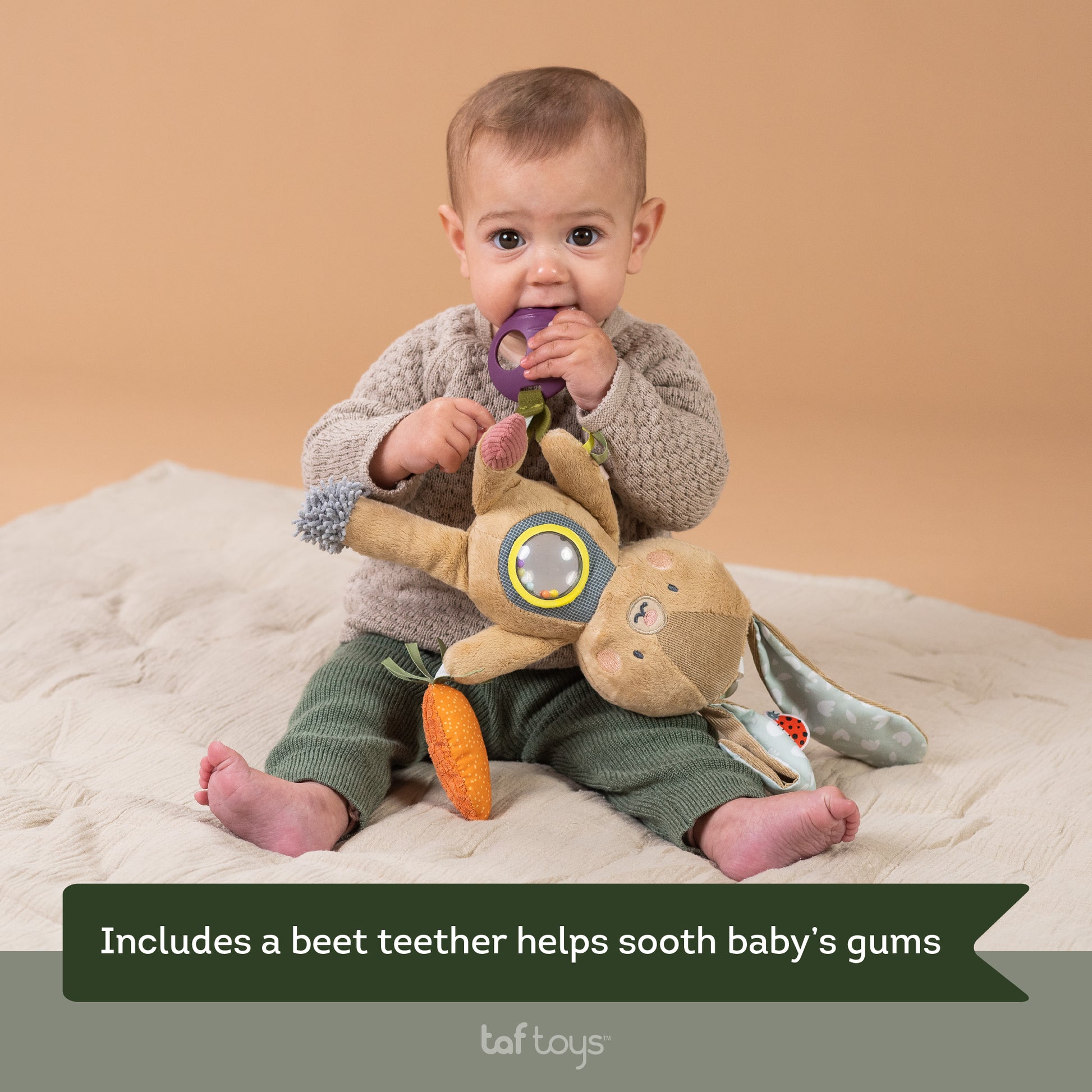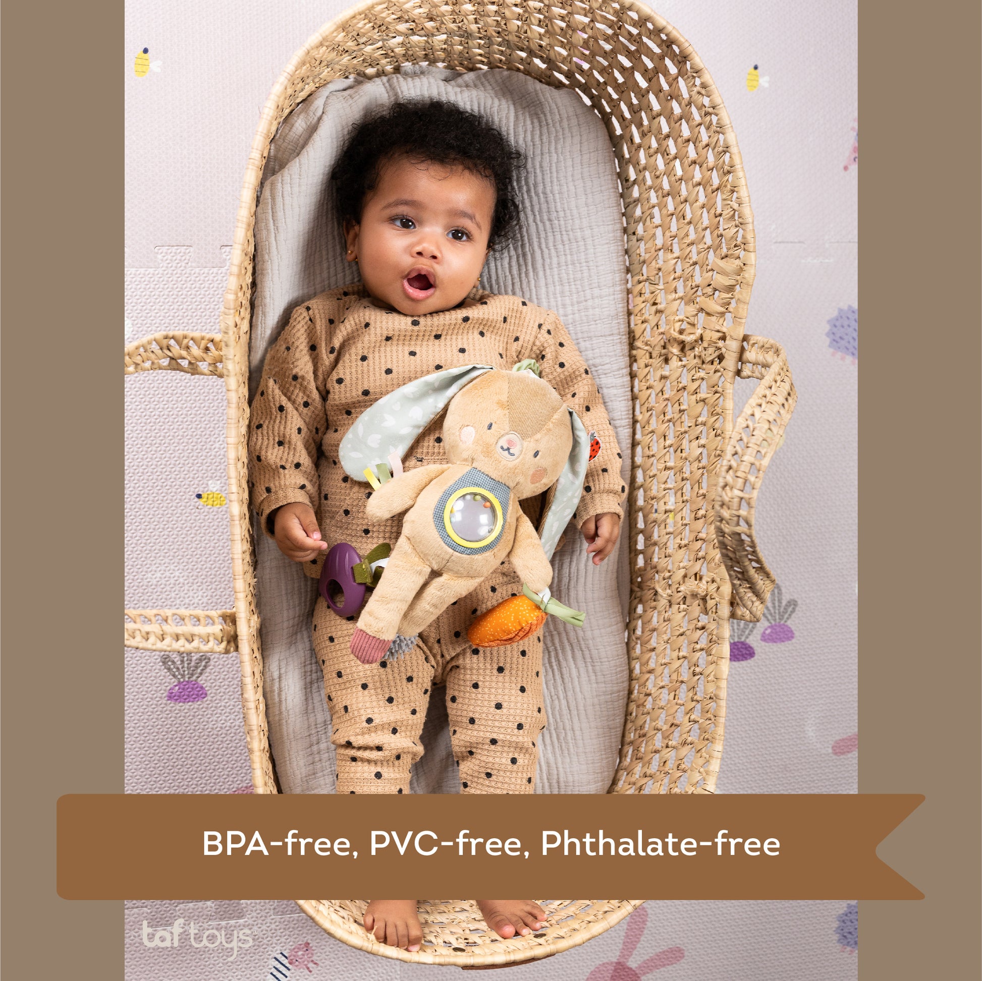El Conejito de Actividades Jenny de Taf Toys es un juguete de desarrollo multifuncional diseñado para entretener y estimular a bebés recién nacidos y niños pequeños. Este juguete suave, seguro y agradable para la piel es perfecto para bebés desde el nacimiento. Jenny Activity Bunny incluye una variedad de texturas, orejas y patas crujientes, y un sonajero que proporciona diferentes experiencias sensoriales para que los bebés las exploren. Ideal para jugar de manera multisensorial, Jenny Activity Toy Bunny puede ayudar en el desarrollo de habilidades motoras finas, coordinación mano-ojo, y habilidades cognitivas en bebés de 0 a 6 meses. Además, es fácil de sujetar a cochecitos, asientos de coche o portabebés, lo que lo hace perfecto para el juego sobre la marcha. Jenny Activity Toy Bunny también es un excelente juguete para aliviar el malestar en bebés que están dentando.