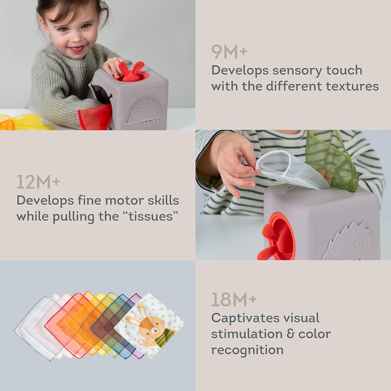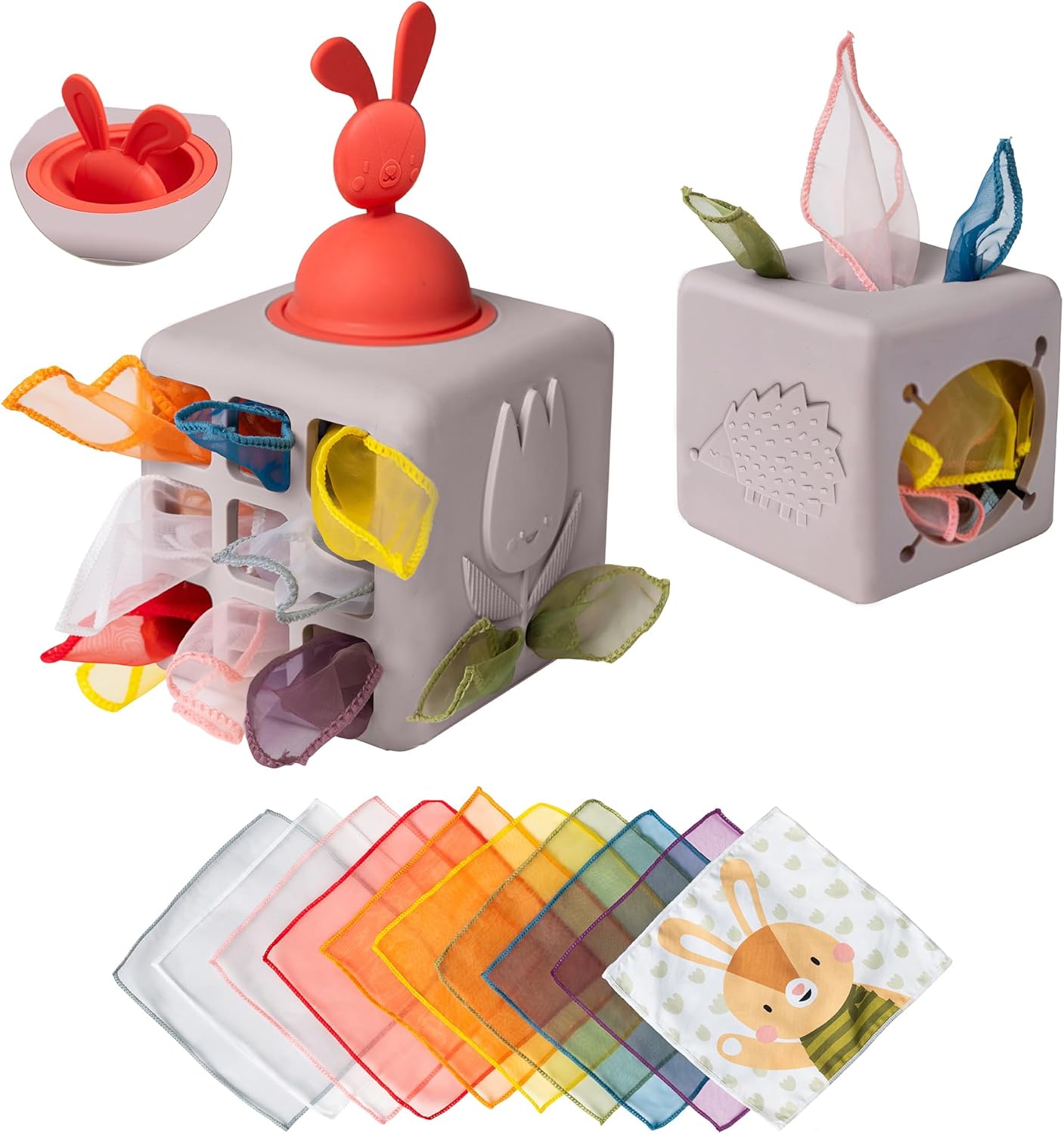 Aprendizaje interactivo: el juguete Baby Silicon Silicon Box está diseñado con seis lados de pura emoción, los bebés descubrirán una divertida cabeza de conejito para sacar y presionar, un lado táctil sensorial de erizo y una flor en 3D para divertirse táctilmente. Además, hay una abertura especial diseñada para que las manos pequeñas agarren los pañuelos. Estimular el aprendizaje sensorial y la motricidad fina del bebé. Viene con 9 telas de organza y una tela ilustrada, promoviendo la motricidad fina, el desarrollo sensorial.