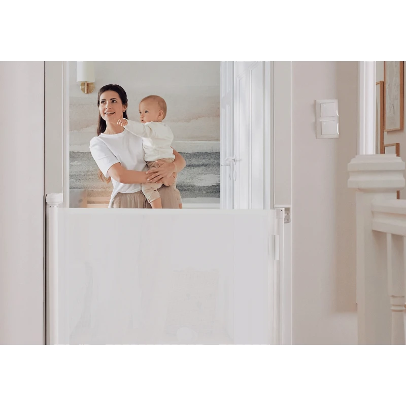 lionelo Thea es una puerta extensible que permite a los padres crear un espacio seguro y vallado para su hijo. El amplio rango de ajuste -hasta 140 cm- hace que la barrera sea adecuada para muchos espacios diferentes, incluso al aire libre. Un mecanismo de doble bloqueo impide que el niño salga por sí solo, y un indicador adicional permite a los padres saber si el bloqueo de apertura está activado. La ausencia de umbral y de elementos estructurales duros, como barras, excluye el riesgo de impacto o tropiezo. Por otra parte, el indicador del montaje correcto de la puerta garantiza que el producto se ha fijado adecuadamente. Se monta fijando la puerta a una pared, al marco de una puerta o a cualquier otro espacio para obtener la máxima versatilidad, estabilidad y seguridad.