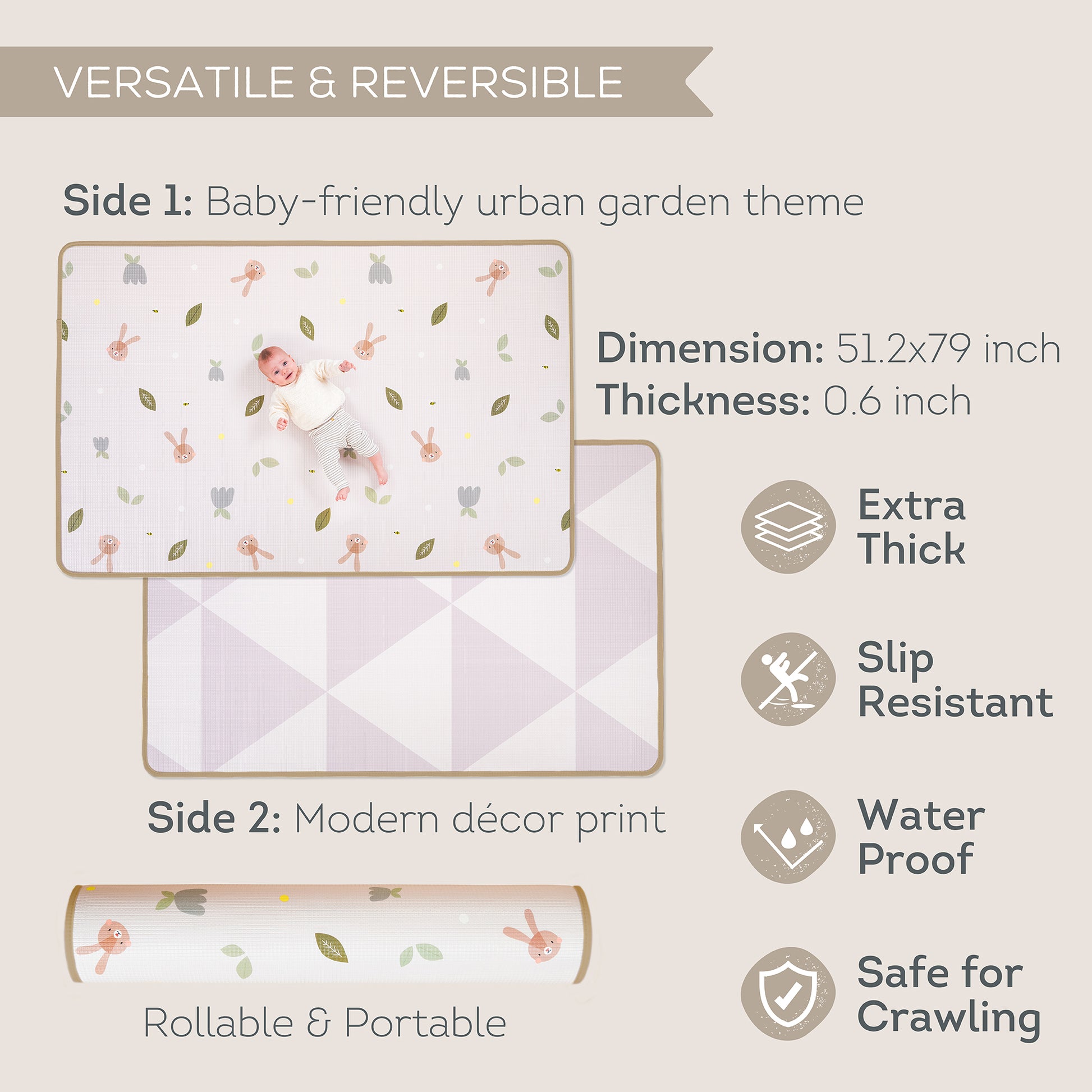 El tapete no contiene sustancias nocivas como BPA, plomo, ftalatos y mercurio, lo que ofrece protección contra suelos duros. Con dos diseños adorables (un tema de jardín urbano y un estampado moderno), este tapete es reversible y te ofrece dos looks en uno. También es fácil de guardar, ya que se puede enrollar y asegurar con una tira que se toca y se cierra.