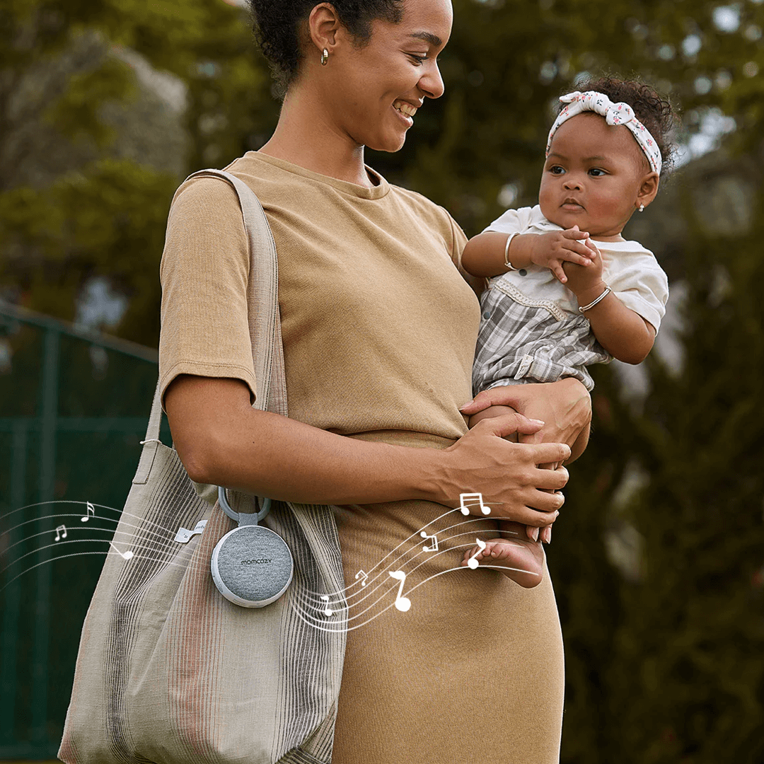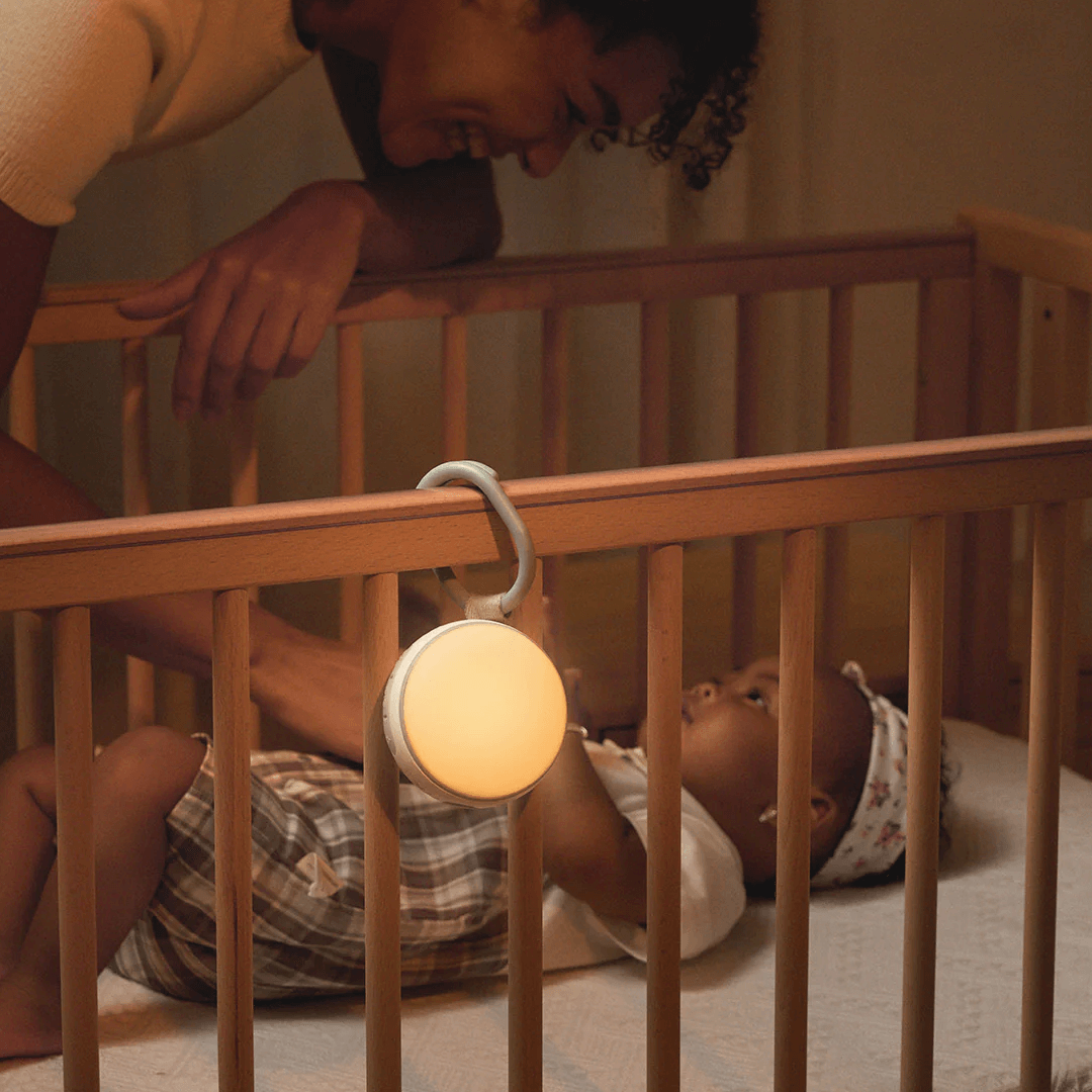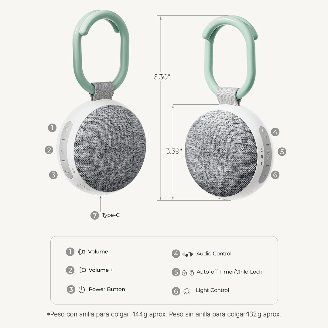 Máquina de ruido blanco / luz ámbar diseñada para acompañar al bebé dentro y fuera de casa. Su formato compacto cabe en el bolsillo del cochecito y la correa integrada permite colgarla en la cuna, el auto o la pañalera.
