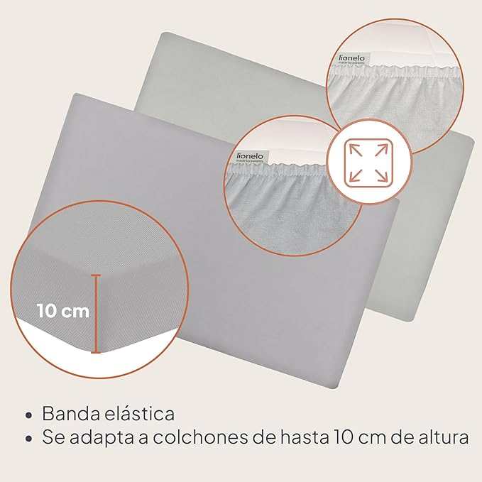 - ADAPTABLE A DIFERENTES MATERIALES: la sábana con banda elástica se adapta a colchones de hasta 10 cm de altura. La banda elástica impide que el tejido se deslice, garantizando estabilidad y comodidad. Apto para cunas de viaje Lionelo.