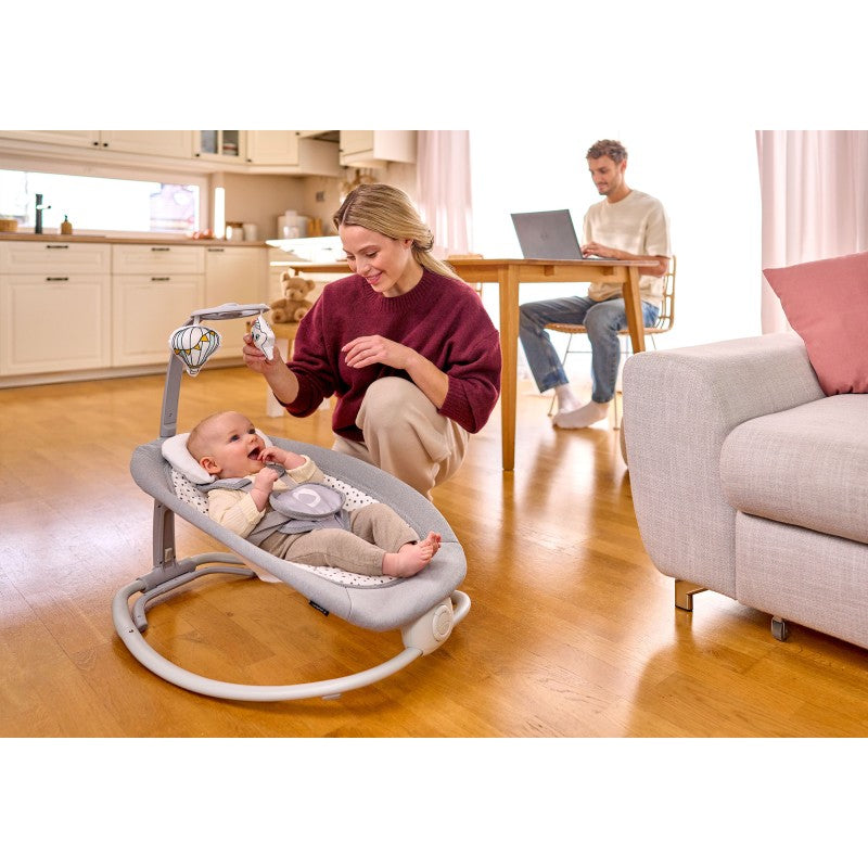 Un cojín cómodo apoya la cabeza del bebé, mientras que un asiento de forma adecuada asegura la posición correcta de la columna. La hamaca mecedora dispone también de una función de vibraciones delicadas que calman al bebé todavía más. Lo hace gracias a la caja de música con 12 nanas, mientras los peluches enganchan al niño pequeño, llamando su atención. Pascal es una hamaca mecedora móvil para usar dentro y fuera de casa, adecuada para niños de hasta 9 kg o hasta que aprendan sentarse solos.
