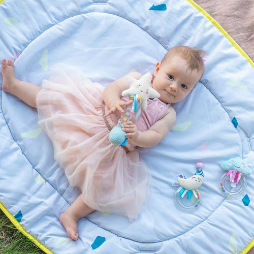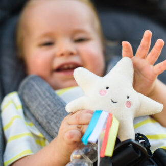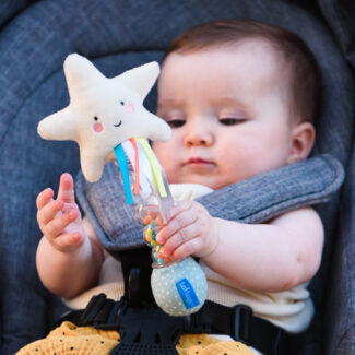 Con una estrella de felpa y cintas de colores para la exploración táctil.