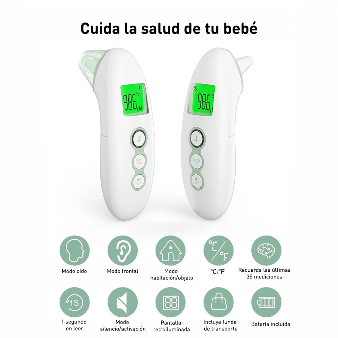 Este termómetro de grado médico no solo es perfecto para medir la temperatura de tu bebé, sino que también te ofrece la flexibilidad de medir la temperatura de la frente y las orejas, de manera cómoda y sin molestias. Además, puede usarse para tomar la temperatura de objetos y el entorno, asegurándote de que tu bebé siempre esté en un ambiente seguro y adecuado. Con solo cambiar de modo, tendrás todas las herramientas para controlar su bienestar en cualquier situación.