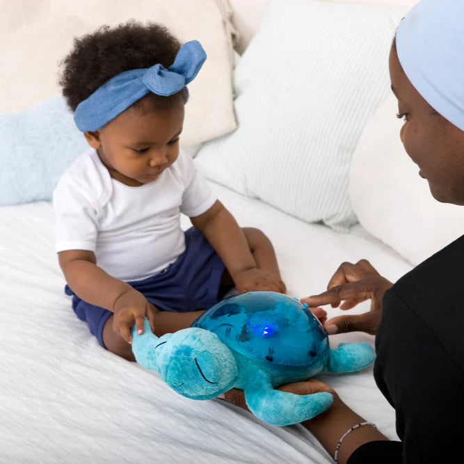 Este proyector es una simpática tortuga musical, fabricada con tejido y relleno de poliéster 100% reciclado, que brilla con una suave luz y proyecta olas oceánicas en movimiento en el techo del dormitorio gracias a un mecanismo único y patentado.